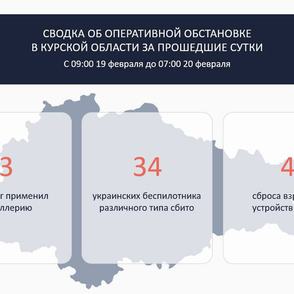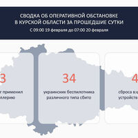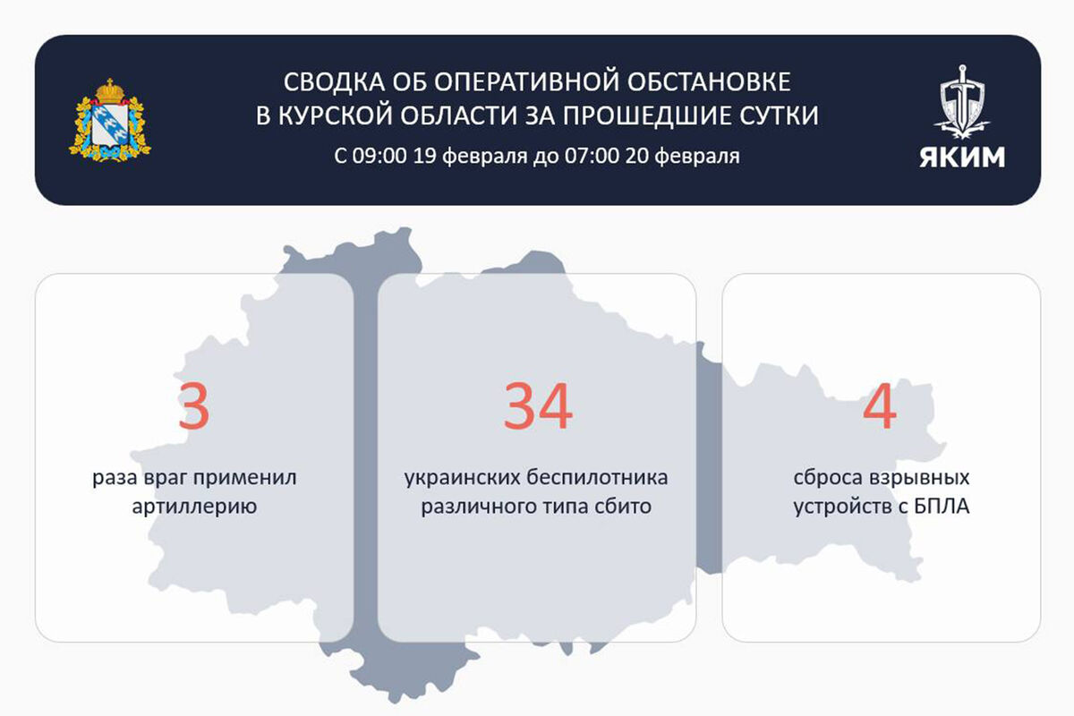 «Всего в период с 09:00 19 февраля до 07:00 20 февраля сбито 34 вражеских беспилотника различного типа. 3 раза враг применил артиллерию по отселенным районам,» — написал губернатор.