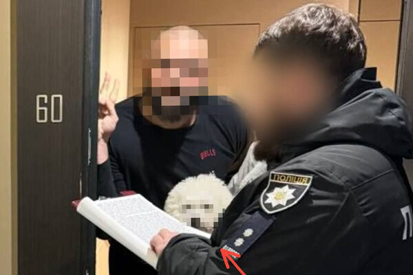 На снимке запечатлена комната, где находятся полицейский и двое гражданских. У одного из них на руках – белая собака, чья морда, как и лица людей, заблюрены.