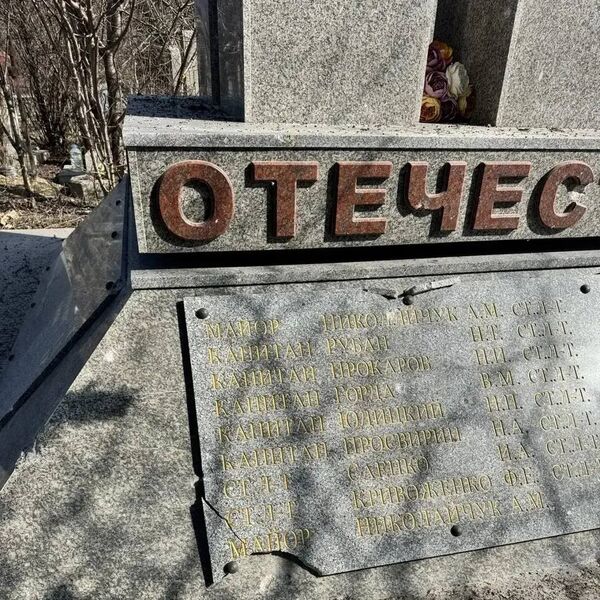 Он уточнил, что плита с именами советских бойцов посечена после удара дрона. Также откололась небольшая ее часть.