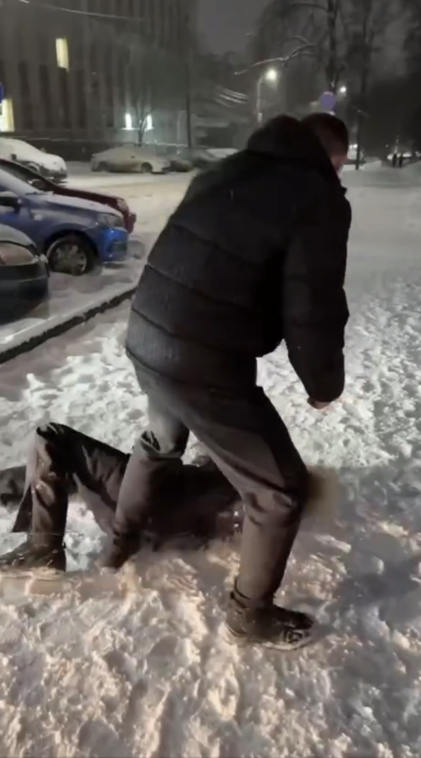 Агрессор жестоко избил юношу — все его лицо и снег, где злоумышленник избивал молодого человека, были в крови. За этим наблюдала толпа людей. Один из очевидцев стал снимать зверство, а затем отвел пострадавшего в сторону. Позже он сходил и за его шубой.