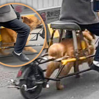 В Китае разгорелся скандал после появления в сети кадров с мужчиной, который передвигался на модифицированном велосипеде, приводимом в движение собственной собакой, пишет South China Morning Post.