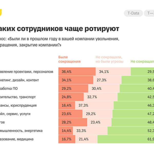 Чаще всего увольнения наблюдались в сферах управления проектами и персоналом (36%), маркетинга, дизайна и контента (34%), разработки ПО (29%). Реже всего — в сферах промышленности и энергетики (14%), образования и медицины (17%).