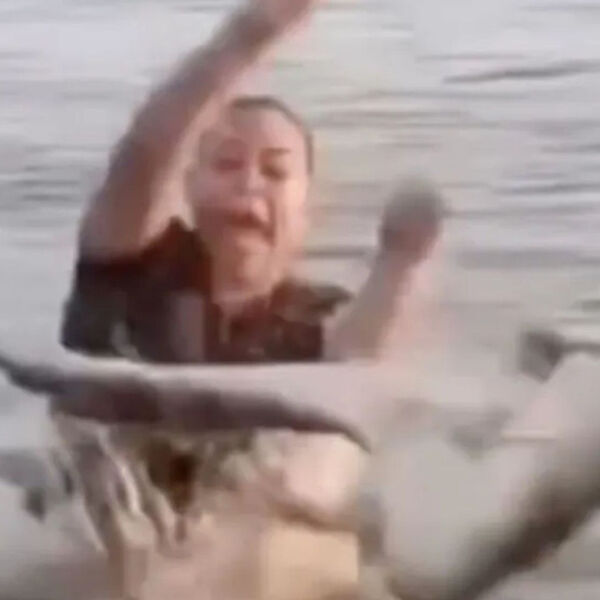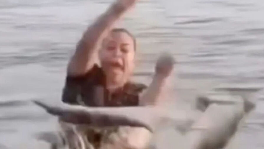 На кадрах видно, как женщина спокойно находится в воде и, судя по всему, не замечает дрейфующий рядом объект. В какой-то момент она касается предмета, похожего на бревно, после чего в панике вскрикивает.