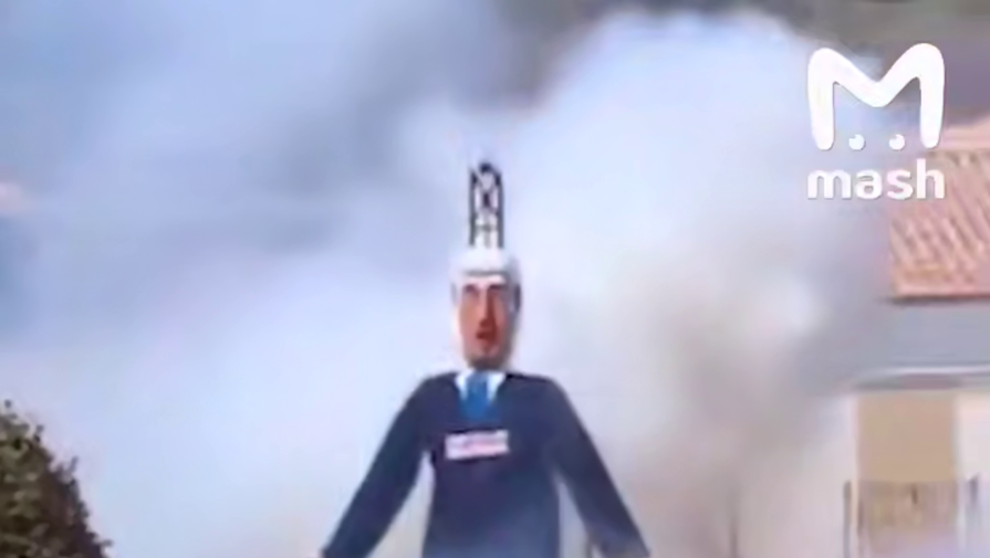 На кадрах чучело сначала подожгли, а потом раздались взрывы и фигуру разорвало на части. Собравшиеся на акции встретили разрушение чучела аплодисментами.