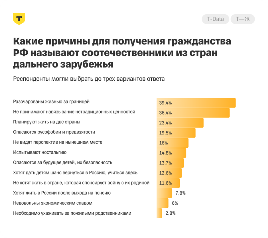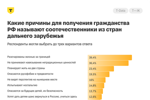 Также среди основных причин получения российского гражданства респонденты называли разочарование жизнью за границей, навязывание нетрадиционных ценностей детям в школе, желание иметь безвизовый въезд в Россию и жить на две страны.