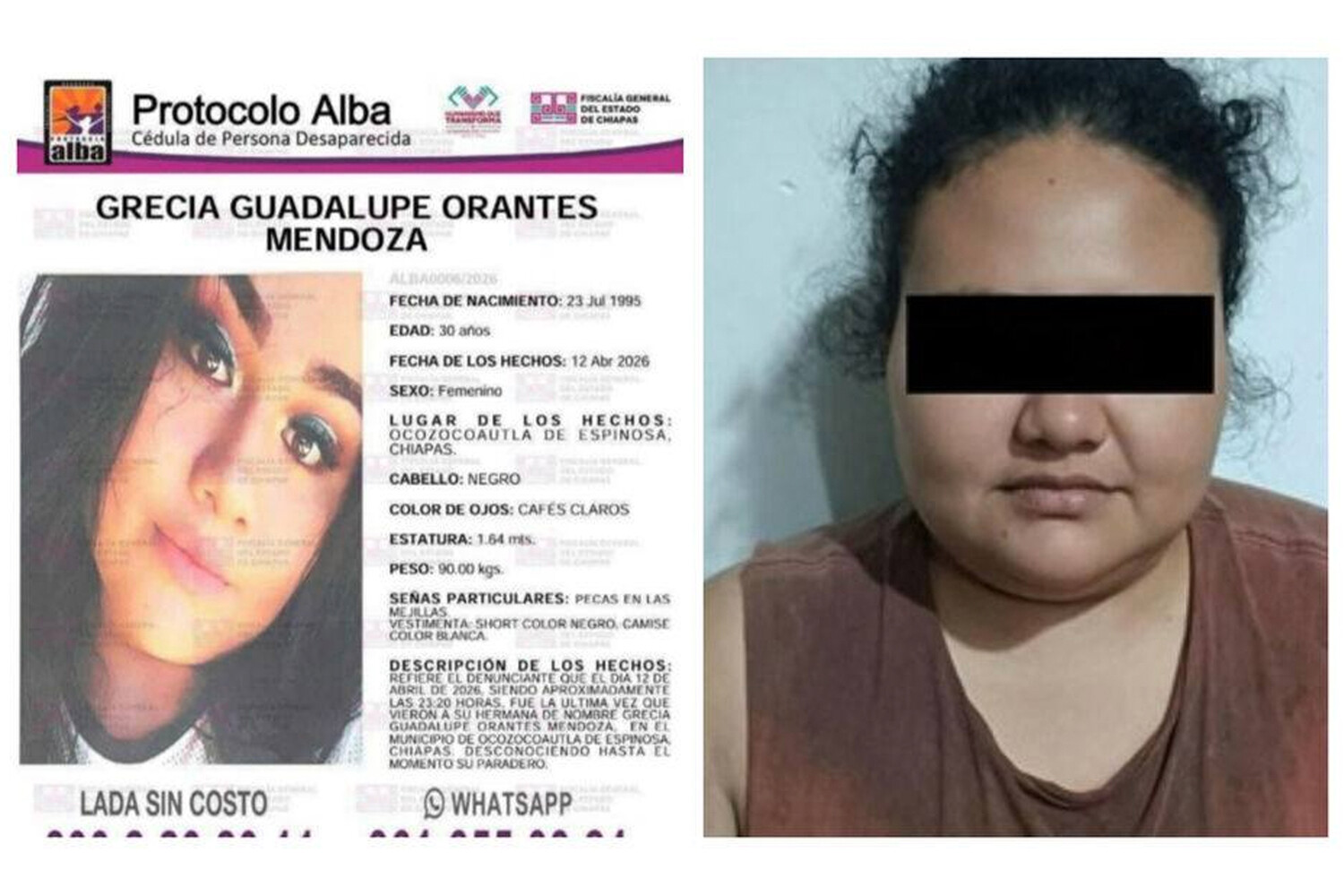 Гресии Гваделупе Орантес Мендоса исчезла в ночь на 12 апреля 2026 года в муниципалитете Окосокоаутла-де-Эспиноса. Семья подала заявление, после чего полиция активировала протокол «Альба» — механизм немедленного поиска пропавших женщин. Для создания плакатов правоохранители использовали фотографии женщины из ее социальных сетей.