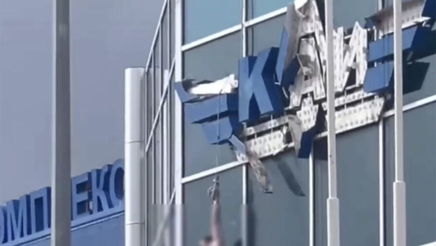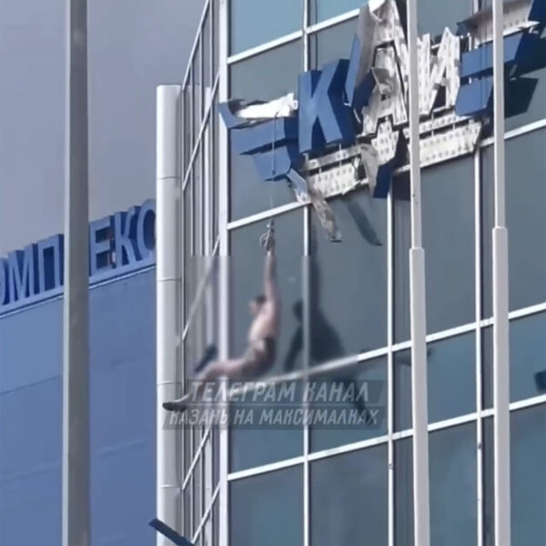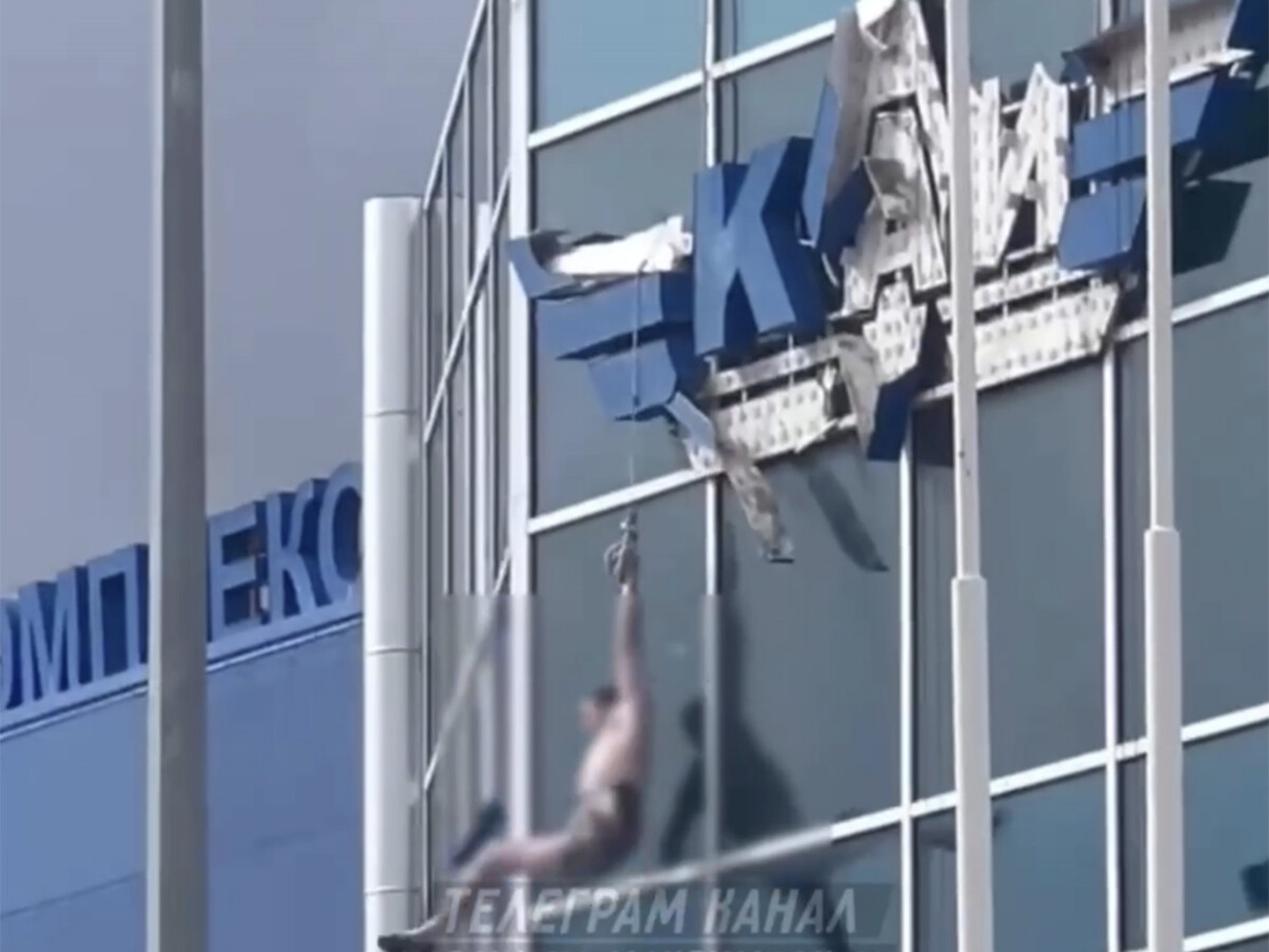 Несколько человек на крыше, предположительно, помогают ему подняться с помощью троса, но мужчина не может удержать равновесие и в какой-то момент падает на козырек здания, где его хватают мужчины.