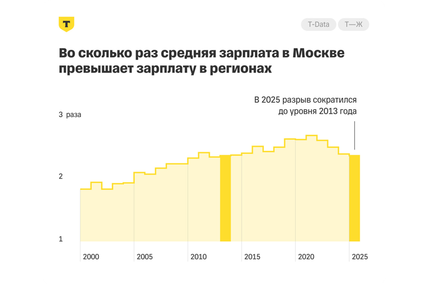 Но если смотреть не на номинальную разницу в рублях, а на соотношение зарплат, то выяснилось, что разрыв в последние годы, наоборот, сокращается. Если в 2021-м работник в Москве в среднем получал в 2,72 раза больше, чем житель провинции, то в 2025-м — уже в 2,39 раза.