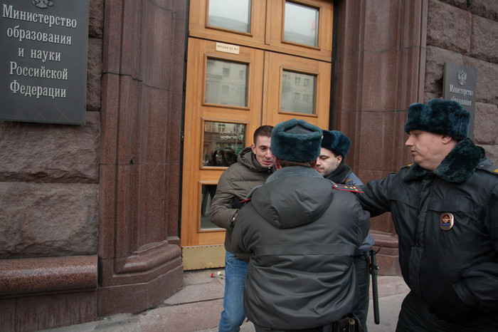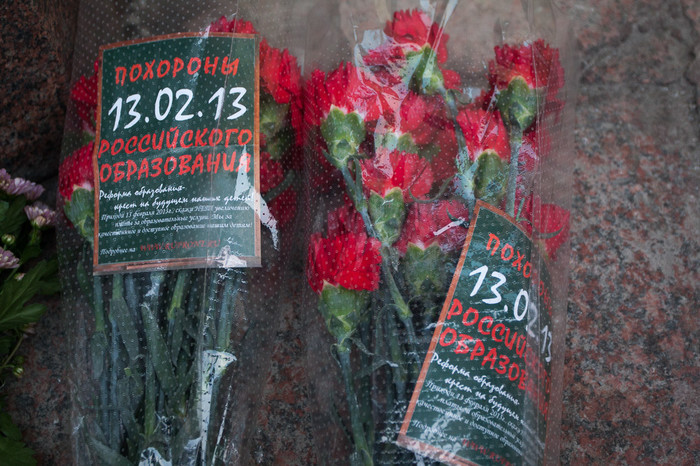 В среду в Москве возле здания Министерства образования и науки прошла акция «Похороны российского образования». Участники акции возложили цветы на крыльцо здания ведомства и раздали листовки с таким текстом: «Похороны российского образования. Реформа образования — крест на будущем наших детей». Во время акции, по информации очевидцев, были задержаны как минимум два человека.