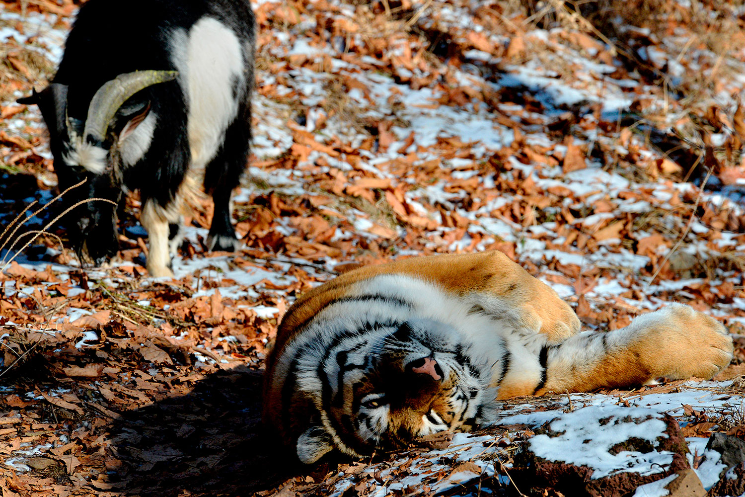 В Приморском сафари-парке амурский тигр по имени Амур не стал есть предназначавшегося ему в качестве пищи козла Тимура. Вместо этого животные подружились и проводят вместе большую часть времени.