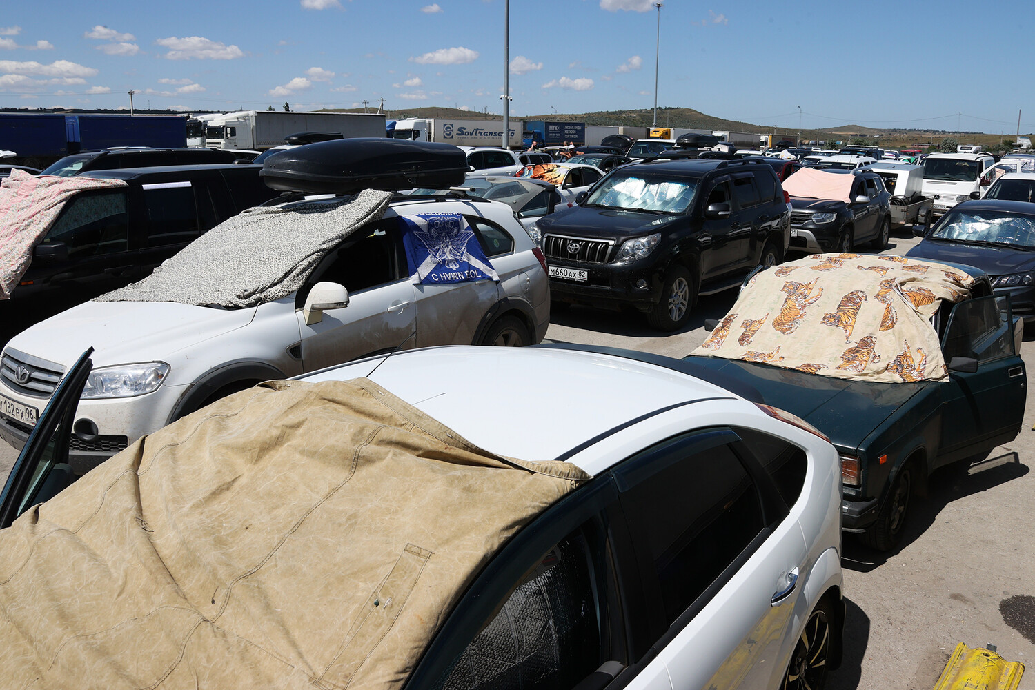 В очереди на паром находятся десятки легковых автомобилей. Люди пытаются спасаться от жары, закрывая лобовое стекло машин от палящего солнца.