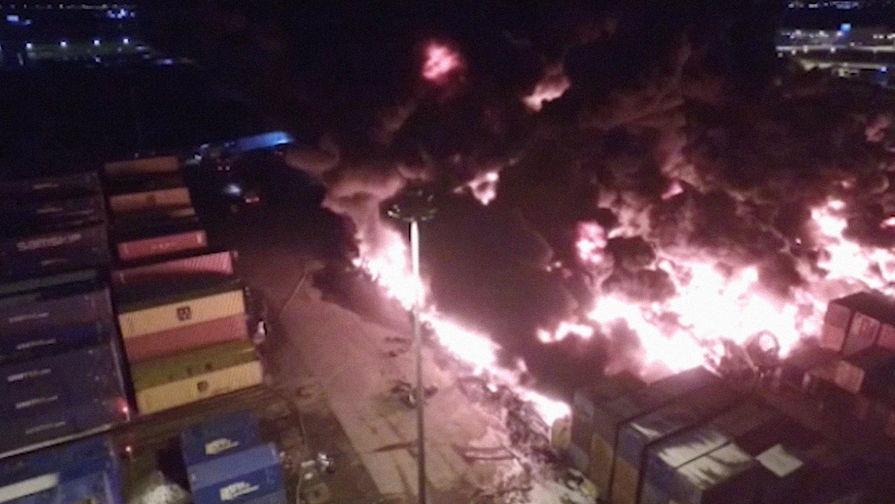 На месте происшествия работают 54 единицы техники, в том числе пожарные поезда, и более 200 человек личного состава. Известно, что горят каучук и стройматериалы. Информации о пострадавших нет.