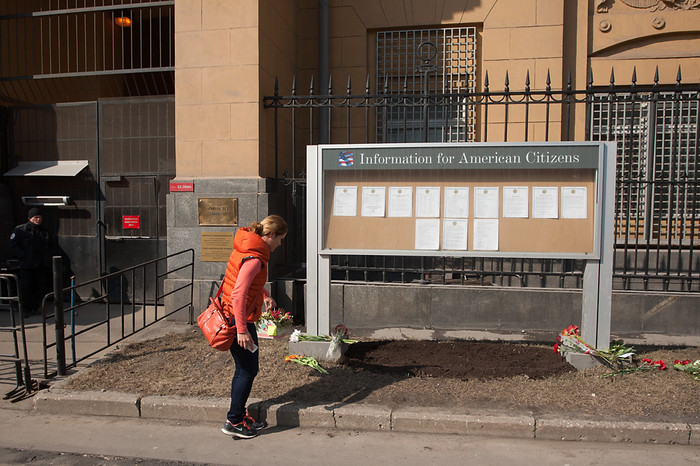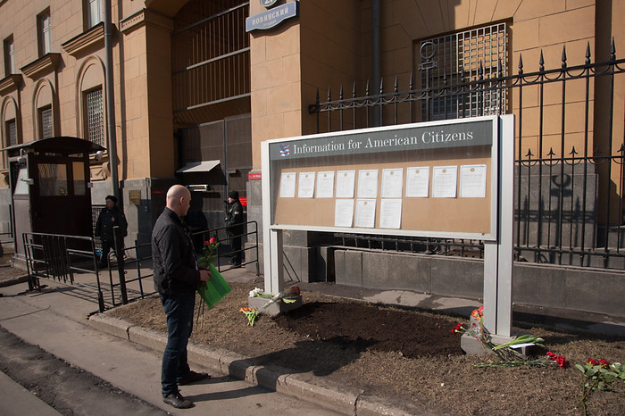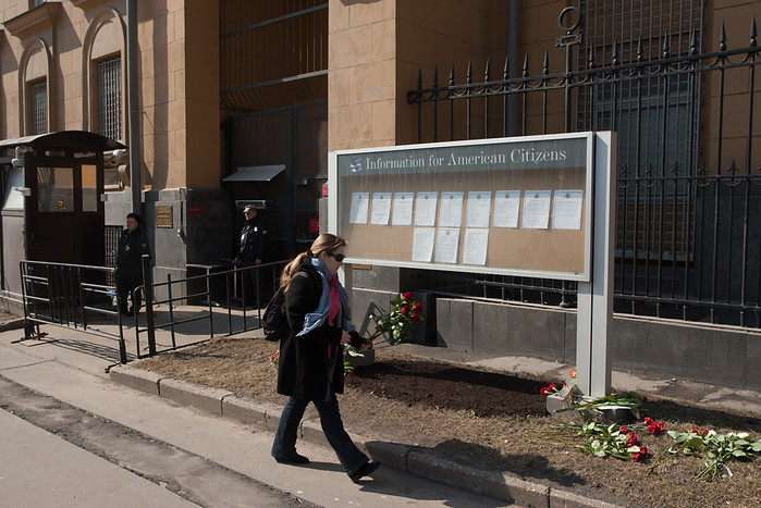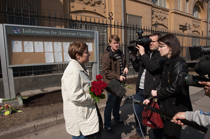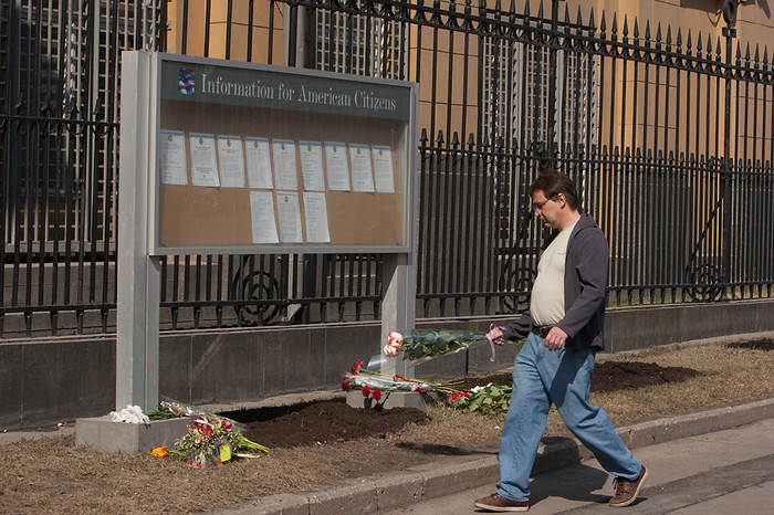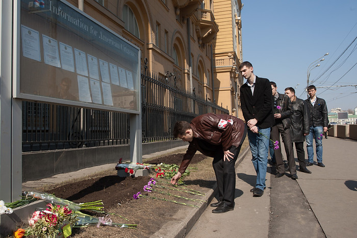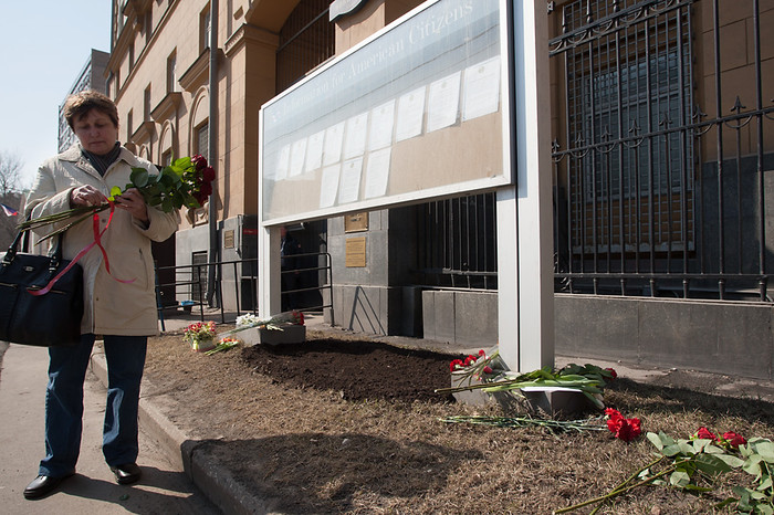 Россияне несут цветы к посольству США в Москве, выражая соболезнования пострадавшим и родственникам погибших в теракте в Бостоне. Два взрыва с интервалом в десять секунд прогремели в Бостоне во время международного марафона. Погибли три человека, пострадали 117. Полиция обнаружила еще две не взорвавшиеся бомбы.
