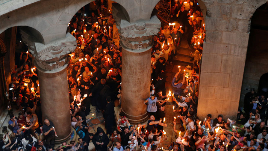 РИА «Новости». Патриарх Иерусалимский Феофил III передал его находящимся в храме людям. Огонь передадут и делегации Фонда Андрея Первозванного (ФАП), которая доставит святыню в особых лампадах спецрейсом в Москву. На улицах Старого Иерусалима собрались десятки тысяч христиан со всего мира, чтобы приобщиться к церемонии схождения Благодатного огня. Благодатный огонь символизирует нерукотворный свет Воскресения Христова, о котором говорил еще апостол Петр, и считается святыней для верующих."/>