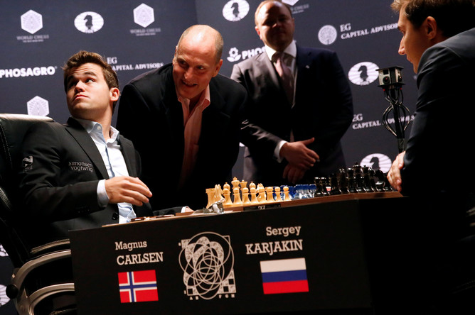 На первую партию матча в Нью-Йорке собрались многие известные персоны как шахматного мира, так и бизнеса и политики. Честь сделать первый ход не только партии, но и всего матча выпала актеру Вуди Харрельсону.