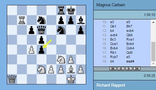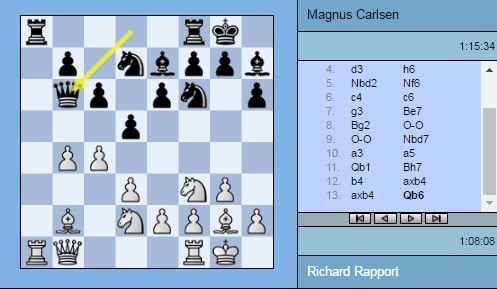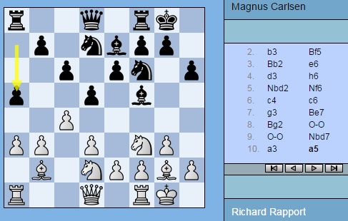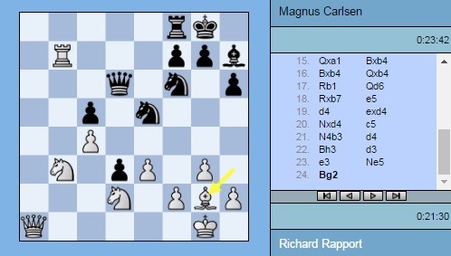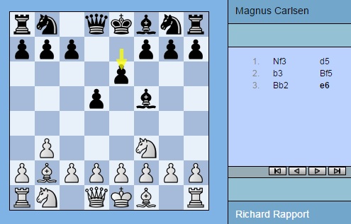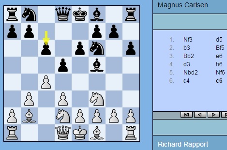 Гораздо медленнее развивается партия Раппорта и Карлсена. Норвежец уже вывел на оперативный простор слона, а вот венгр предпочитает, чтобы его аналогичная фигура выглядывала из-под пешечного покрова. Осторожничает.