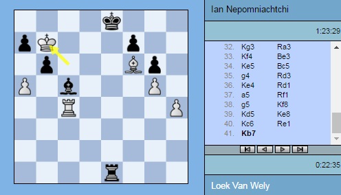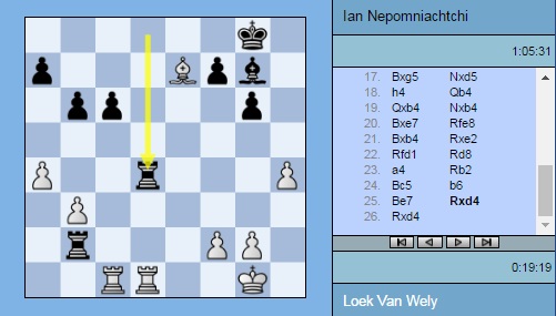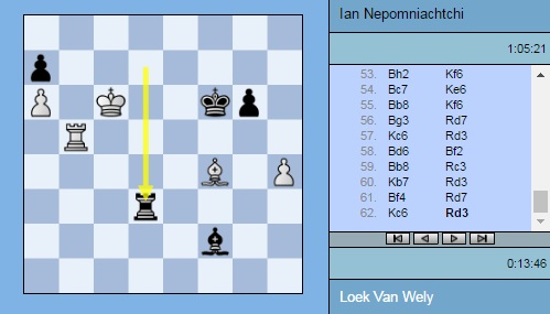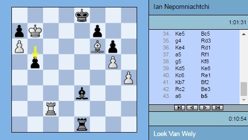 Пока не теряют надежд ван Вели и Непомнящий подловить друг друга на ошибке и не соглашаются на ничью, хотя позиция абсолютно равна.