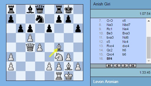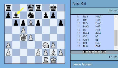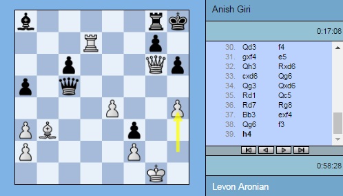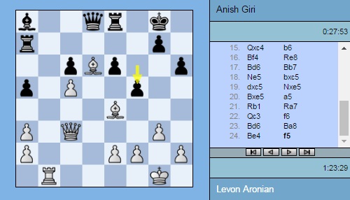 Левон Аронян в партии с вчерашним героем Анишем Гири начинает активничать. Последним ходом армянский гроссмейстер усилил давление на ферзевый фланг.