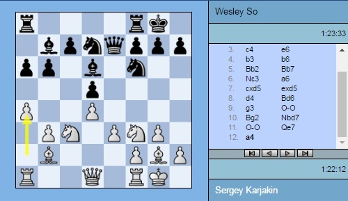 Карякин пошел 12-м ходом a4. По мнению гроссмейстера Михаила Красенкова, чемпион мира по блицу готовится к размену чернопольных слонов.