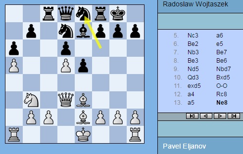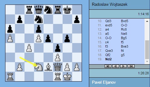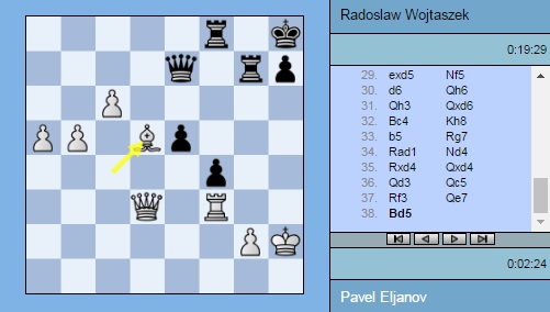 Эльянов уже вовсю зажимает Войташека, поляк же полностью забаррикадировался всевозможными фигурами. Выглядит это немного забавно.