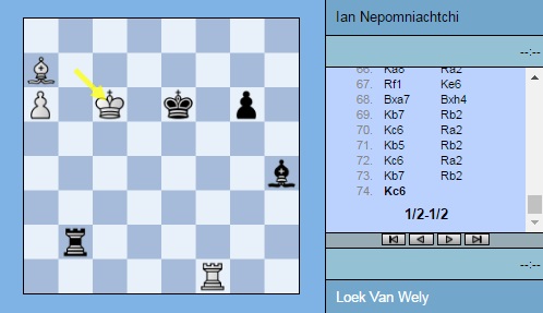 Все-таки согласились на ничью Непомнящий и ван Вели после 74-го хода белых. Возникла ситуация, при которой слон белых не мог покинуть свое поле, чтобы освободить место для продвижения пешки.