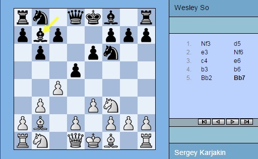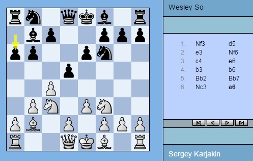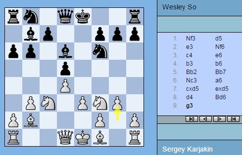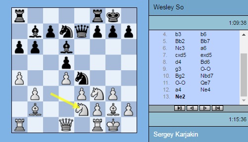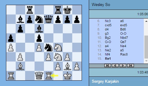 У Карякина, как всегда в начале партии, спокойное и стабильное положение: легкие фигуры развиты, но почти все прикрыты пешками, которые, в свою очередь, защищают друг друга. Уэсли от безысходности решил продвигать пешки на ферзевом для россиянина фланге. Интересное развитие событий.