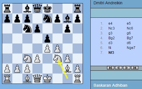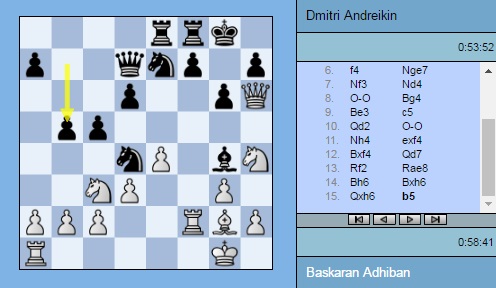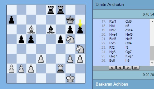 Адхибан начинает создавать небольшие неприятности для Андрейкина. Раздражающий черных ферзь на h6 и давление ладьи на f7 заставляют черных играть с большой оглядкой.