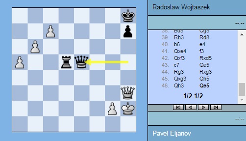 Эльянов с Войташеком разошлись миром. Поляк нашел вечный шах, и украинский гроссмейстер не смог воспользоваться преимуществом трех проходных пешек.
