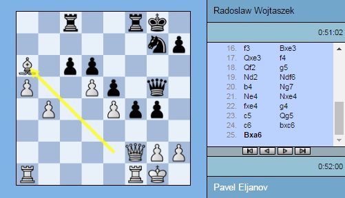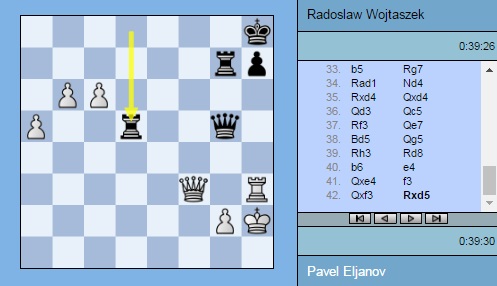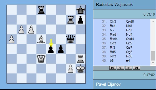 У украинца с Войташеком очень интересная позиция. У поляка ладья против слона белых, но у Эльянова сразу три проходных пешки.