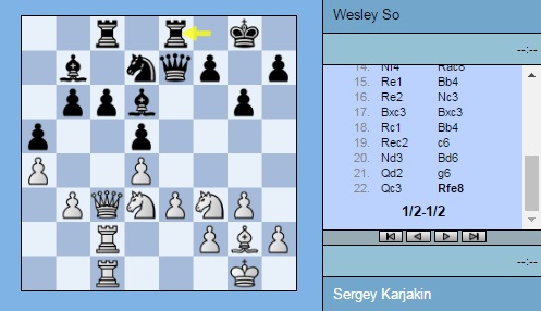 Вот это да! Карякин и Со согласились на ничью после 22-го хода. По сути игра только завязывалась, и мы ожидали впереди много интересной борьбы, но шахматисты решили иначе.