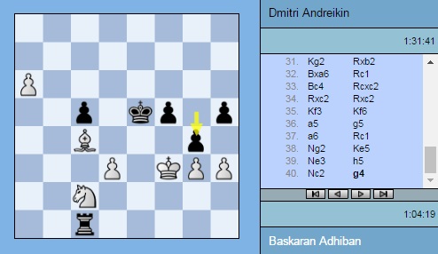 Адхибан в шаге от победы над Андрейкиным. Точнее — в одном ходе. Ему нельзя бить пешку g4, потому что в этом случае черные освобождают вертикаль f, которая позволит ладье вернуться на восьмую горизонталь и остановить проходную пешку а. Надо уходить королем на е3. Это не пускает ладью, и дает возможность провести пешку. В этом случае черные имеют возможность также провести пешку, но с потерей темпа, что приведет к, в итоге, к победной атаке белых.