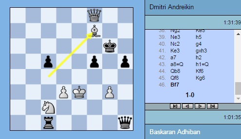 Индиец Адхибан, похоже, всерьез настроен на россиян. Он уже обыграл Карякина черными, а теперь имеет белыми большое преимущество в партии с Андрейкиным — два коня против одной ладьи.