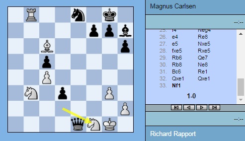 А вот так Карлсен признал свое поражение в партии против Раппорта, Причем, норвежец сам виноват — в объективно ничейной позиции он решил обострить игру, открыв тылы, и этим воспользовался венгерский шахматист.