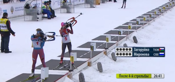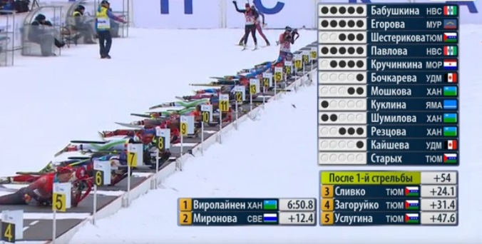 Первая стрельба. Лежа. Плохо стреляет Миронова — и лидирует Виролайнен, «везя» Светлане 12 секунд! Как быстро поменялась сиутация, кто бы мог подумать.