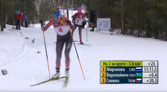 На отметке 3,6 км Миронова вернула себе лидерство. Но это все так, на тоненького. Вровень идут с Виролайнен.