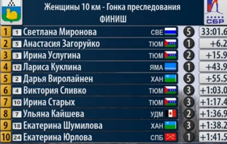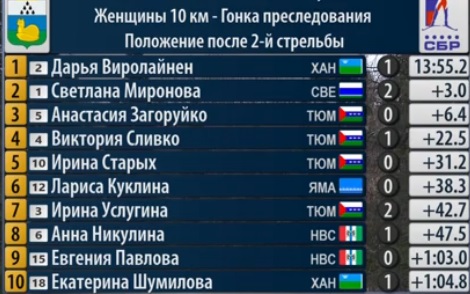 Виролайнен первая, Миронова с трехсекундным отставанием — вторая после второго рубежа. Но и остальные теперь значительно подтянулись. Загорулько с гандикапом в 6 сек — третья.