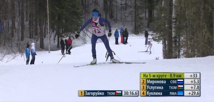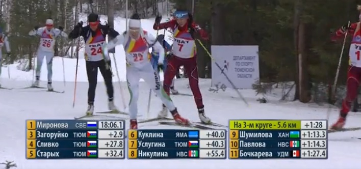 Прошли отсечку 7,6 км. Миронова, за ней Загоруйко сразу. Старых 19 сек проигрывает.