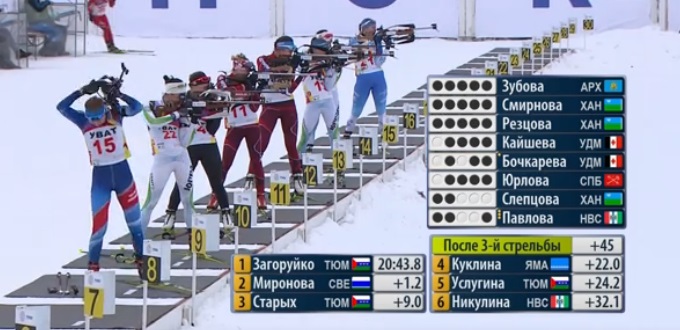 Миронова выходит на второе место. Лишь 5 сек сейчас проигрывает, а было 13 после 4-й стрельбы! Услугина 8 сек уступает.