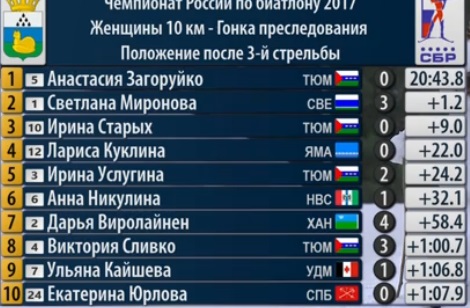 Ох, три промаха у Виролайнен. Это ее извечная проблема. У Мироновой — один штрафной круг, пулей она его прошла. А в лидеры вышла Загоруйко, обошедшаяся без ошибок. Интрига!