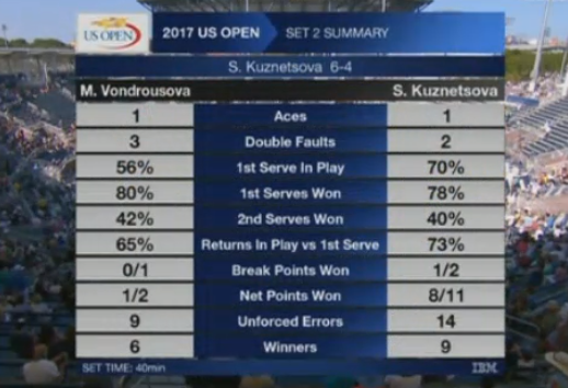 Кузнецова сравняла счет, но тут же ошиблась, вступив в близкую перестрелку с соперницей, но не сумев отправить мяч ей за спину. В итоге это сумела сделать чешка. Больше у Вондроушовой.