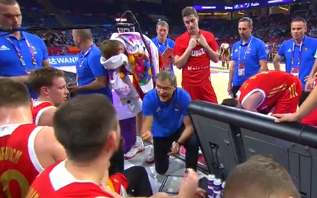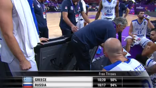 Кулагин, подвернувший ногу, появляется на площадку! Тем временем греки сфолили. Воронцевич промазал оба раза, но звучит сирена! Конец матча! Мы победили!
