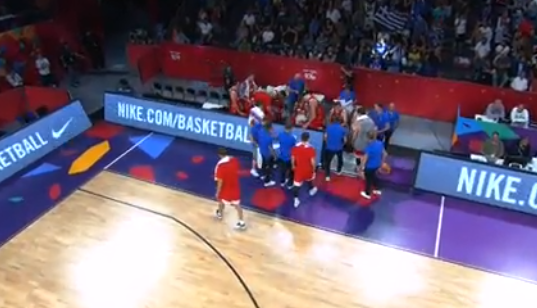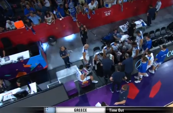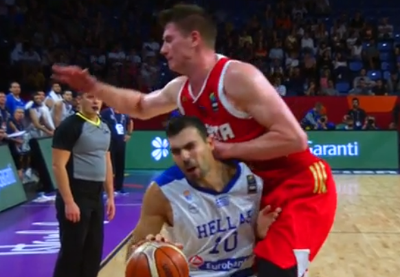 Греки убежали в контратаку, и Швед помешал Принтезису нормально бросить. Будут штрафные броски.