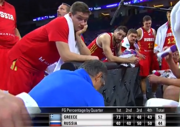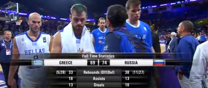 Калатес бросил издали и промазал! Но Фридзон дотронулся до мяча, и будет аут в пользу греков. Калатес ввел мяч в игру, Слукас получил мяч и промазал издали! Россияне неспешно начали атаку, и Швед забрасывает из-под кольца! 51:51!