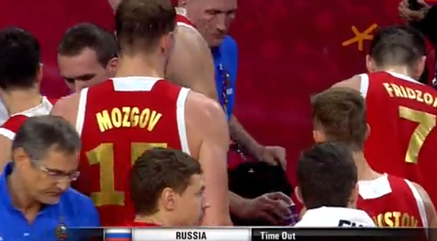 Мозгов забросил мяч, несмотря на то что на нем сфолили! 35:26. Теперь уже очередь Костаса Мисаса брать тайм-аут.