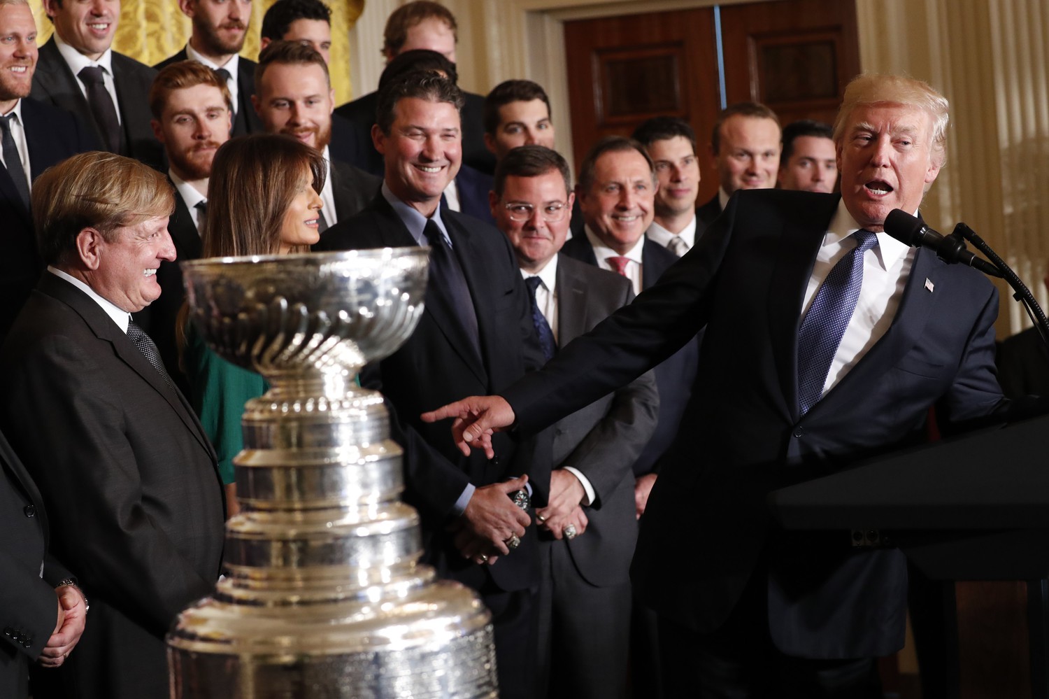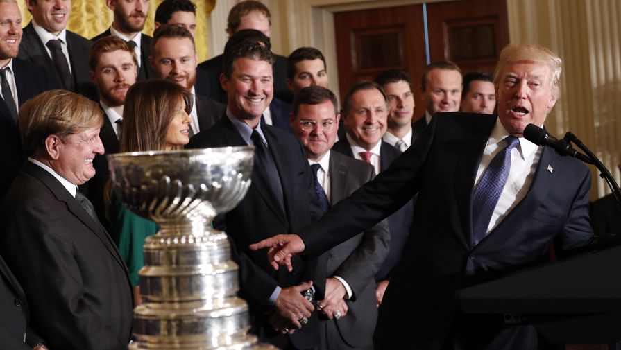 Очередной игровой день разогнавшегося чемпионата Национальной хоккейной лиги стартовал с важнейшего события. После сорванного визита в Белый дом баскетбольного чемпиона «Голден Стэйт Уорриорз» президент США Дональд Трамп принял на рабочем месте обладателей Кубка Стэнли из «Питтсбург Пингвинз». Глава государства достаточно мило пообщался с хоккеистами, сравнив 191-сантиметрового Евгения Малкина с баскетболистом.