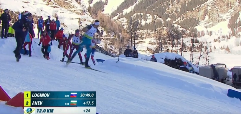 Последняя контрольная отсечка. 12 км — здесь Анев проигрывает 17,5 сек уже. Бежит медленно. Так что чемпионом станет Логинов — это уже понятно.