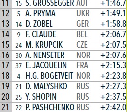 Малышко — 19-й, Шопин — 20-й, Пащенко — 21-й. Кучно приходят на финиш остальные россияне.