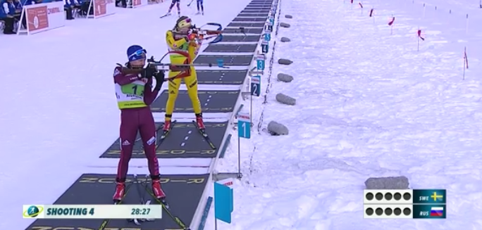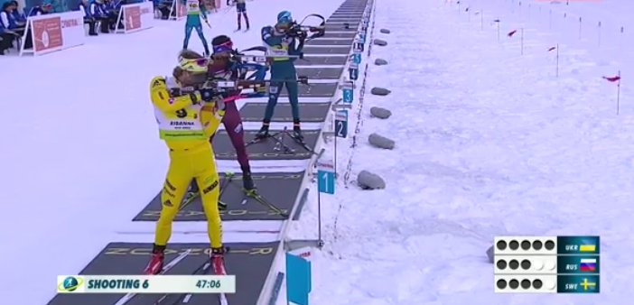С огневого рубежа россиянка ушла третьей с отставанием +6,6 сек от лидирующей шведки Скоттхейм. На второй позиции — итальянка Алексия Рунгальдьер.