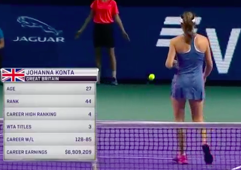 Очередной гейм начинается с того, что Конта вышла к сетке и попыталась пробить укороченным, но Касаткина разгадала эту хитрость и перехватила мяч, очень легко отправив его в недосягаемую зону — 15:0.