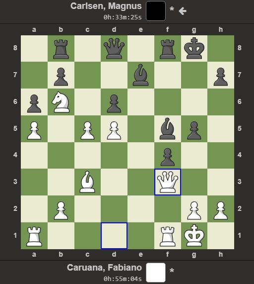 Убирает второго коня Магнус обратно на b8, Фабиано продвигает линию а, идет пешкой на а4.